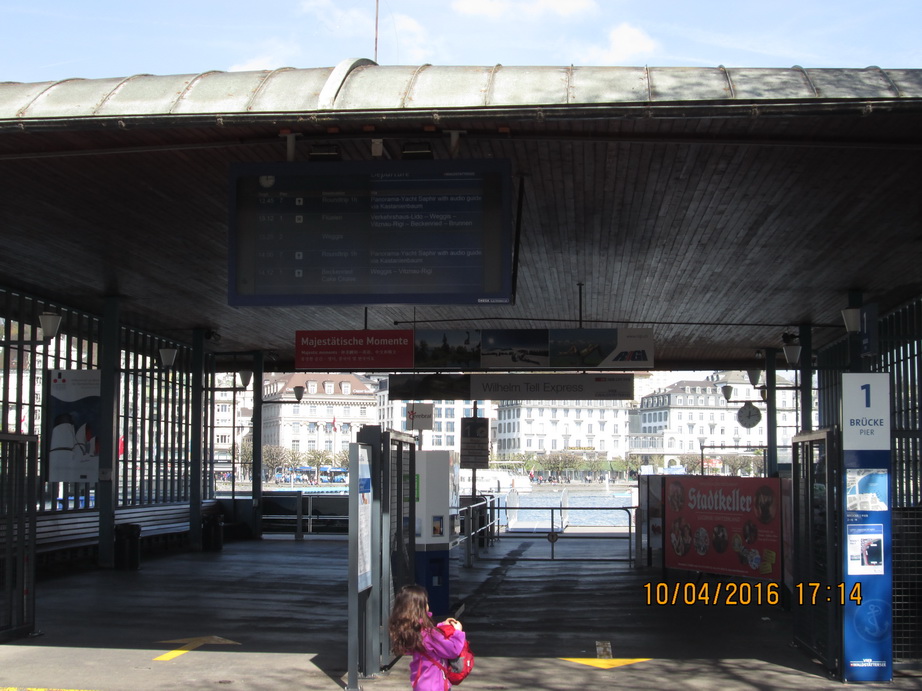 > ขากลับหากจะลงทาง Vitznau หรือ Weggis ให้ไปรอรถไฟสีแดงที่ชานชาลาที่ 2 แล้วย้อนกลับทางเดิม