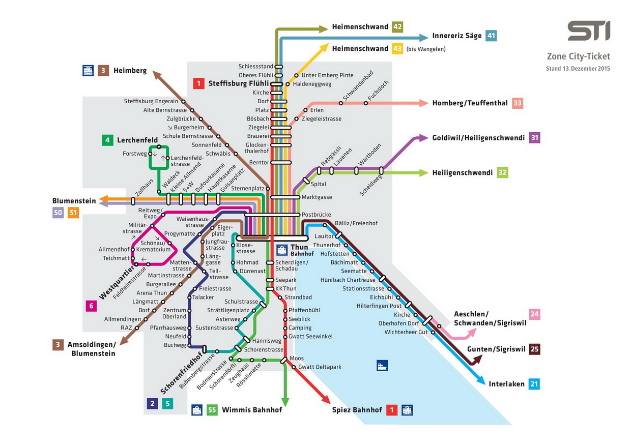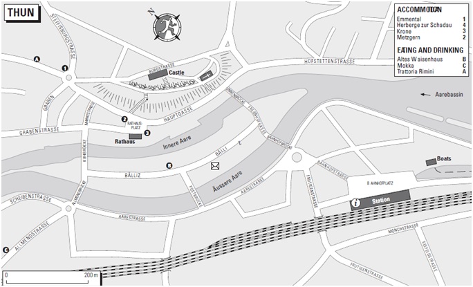 จากสถานี Thun ให้นั่ง รถบัส เบอร์ 1 ตรง Platform ที่ 3 (Direction : Steffisburg/Flühli) ลงที่ป้าย Berntor ซึ่งจะอยู่แถววงเวียน แล้วก็เดินไปต่อเอา (ขากลับนั่งรถบัสคันเดิม Direction : Spiez, Bahnhof