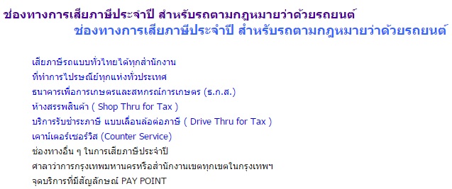 ต่อไปเป็นการชำระภาษีรถยนตร์ (บางคนเรียก ต่อทะเบียนรถ) ทำได้หลายช่องทาง ดังรูปด้านบน