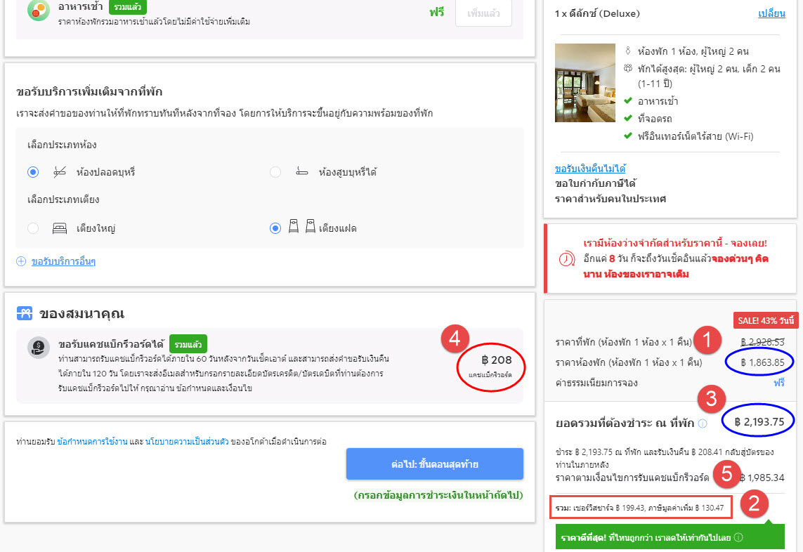 ควรลองสำรวจราคาจาก Agoda.com , Booking.com และการจองโดยตรงกับโรงแรมที่พัก เพราะที่ได้เปรียบเทียบมาพบว่าการจองผ่าน Agoda.com ราคาถูกกว่าจองโดยตรง , มี Cashback คืนเข้าบัตรเครดิตให้ และอาจยังไม่ต้องชำระเงินในทันทีด้วย
