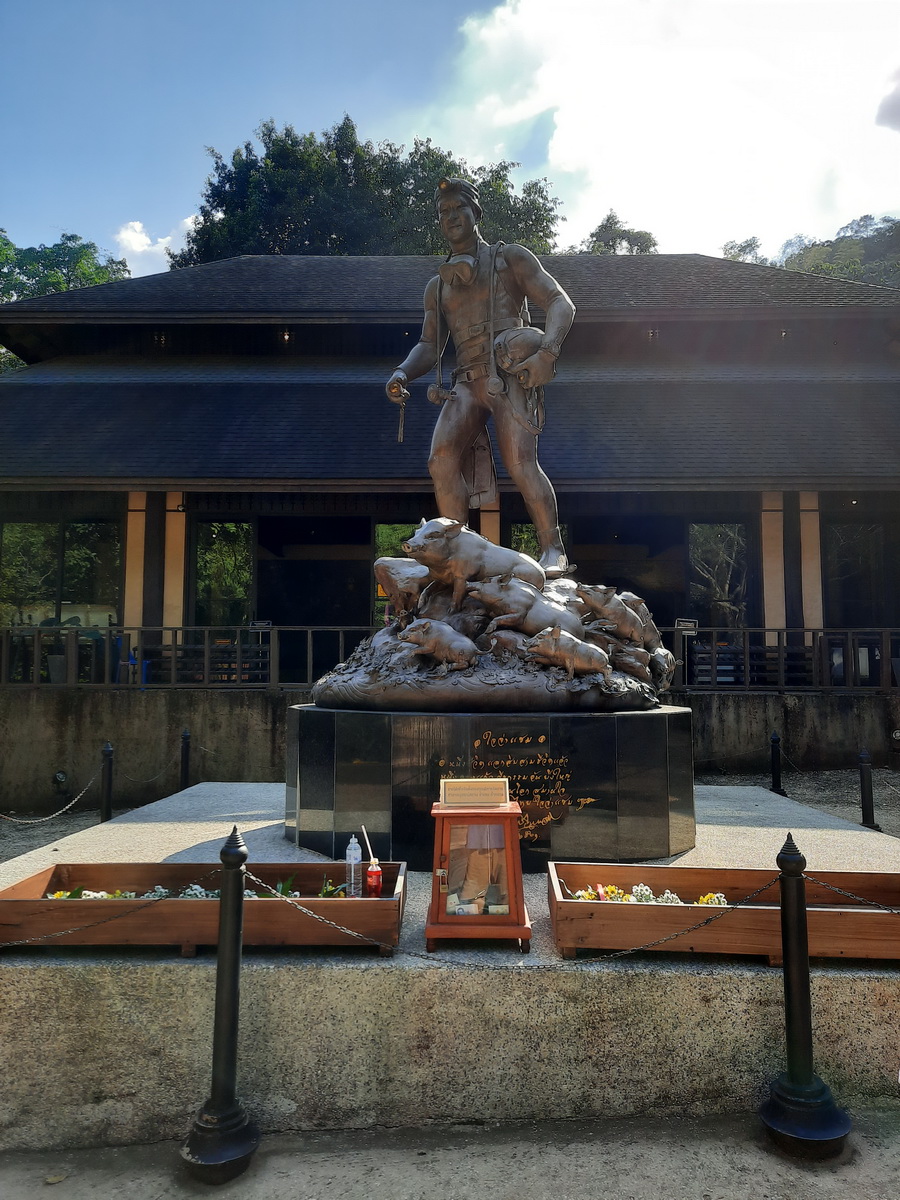 อนุสาวรีย์ของจ่าแซม จะมีขนาดใหญ่เป็น 2 เท่าของคนจริง วางไว้บนโขดหินเหมือนถ้ำ ลักษณะของอนุสาวรีย์จ่าแซมจะสวมชุดนักดำน้ำและกำลังทำท่าเดินไปข้างหน้า รอบๆ ขาจะมีรูปปั้นหมูป่า 13 ตัวและน้ำล้อมรอบ โดยอนุสาวรีย์ของจ่าแซมจะอยู่บนเนินกลางเกาะ ส่วนเท้าของอนุสาวรีย์ก็จะอยู่ระดับเท่าศีรษะของคนดู สีรูปปั้นจะออกสีน้ำตาล