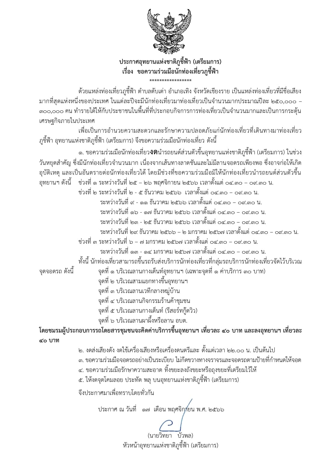 ในช่วง High Season บางวัน (ช่วงเดือนพฤศจิกายน - มกราคม) ทางอุทยานแห่งชาติภูชี้ฟ้าฯ จะไม่ให้นำรถยนต์ส่วนตัวขึ้นไปจอดบริเวณลานจอดด้านบน เนื่องจากมีนักท่องเที่ยวจำนวนมาก