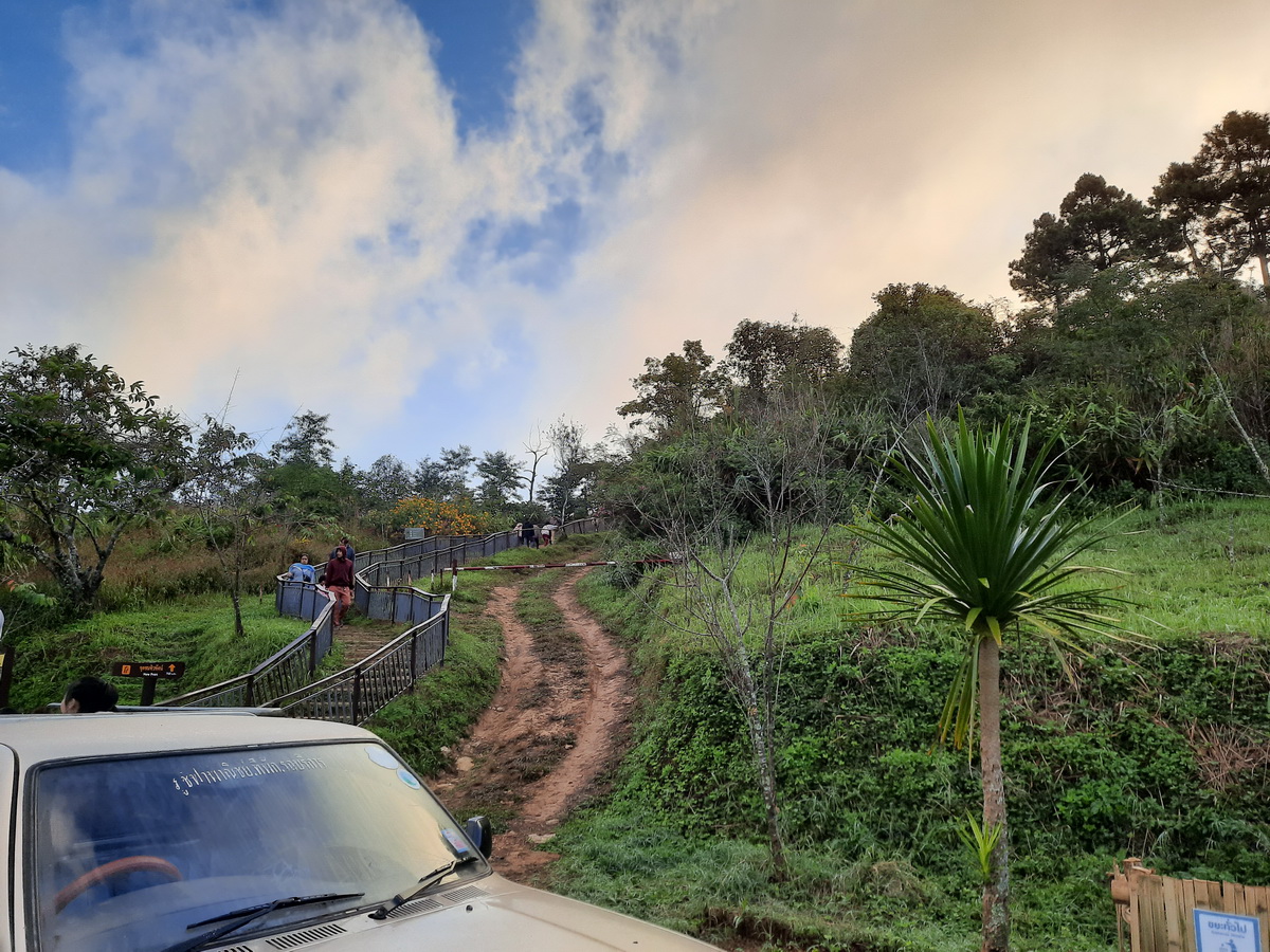 - ทาง บ้านร่มฟ้าไทย (ต.ตับเต่า อ.เทิง) จะเป็นลานจอดรถของอุทยานฯ (ผมไปทางนี้) โดยจากลานจอดรถ ยังต้องเดินเท้าขึ้นไปเองอีกประมาณ 750 เมตร (ควรเตรียมไฟฉายที่สว่างๆไปด้วย เพราะทางเดินไม่มีไฟส่องสว่างให้)