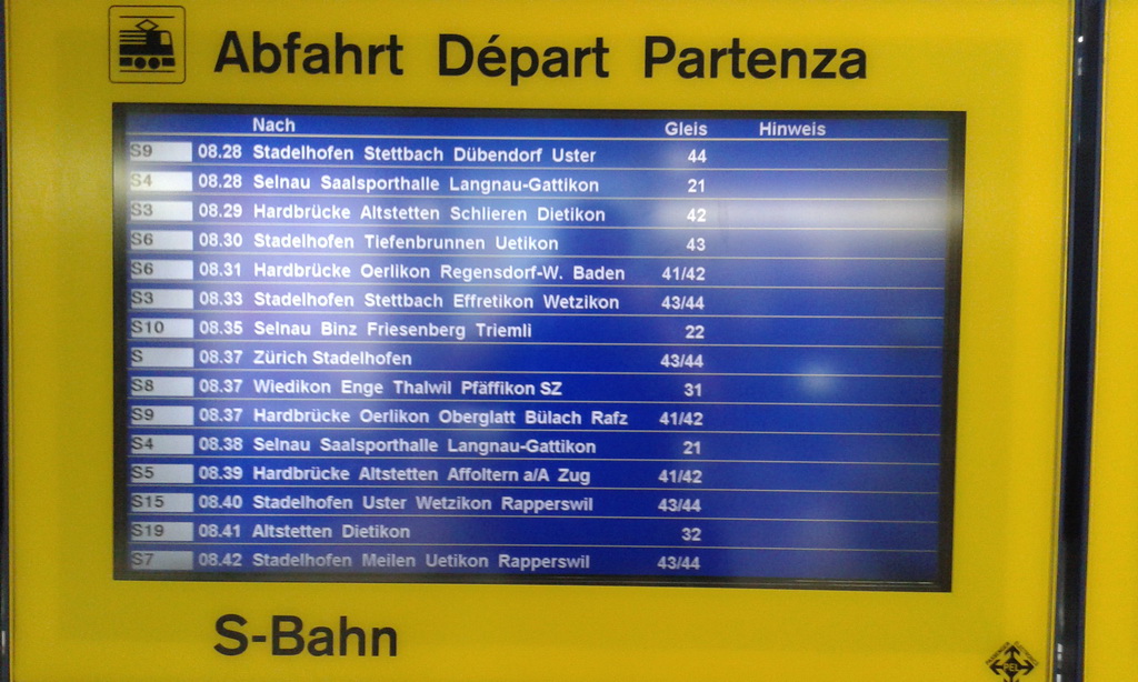 อันนี้คือบอร์ดตารางเวลารถไฟหลักของสถานี Zurich HB ... คนต่างถิ่นเห็นแวบแรกแล้วอึ้งไป 5 นาทีได้ แต่ใจเย็นๆ จริงๆแล้วไม่มีอะไรเลย